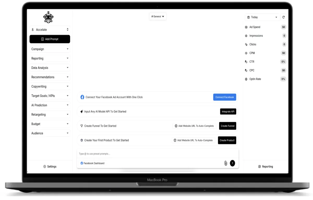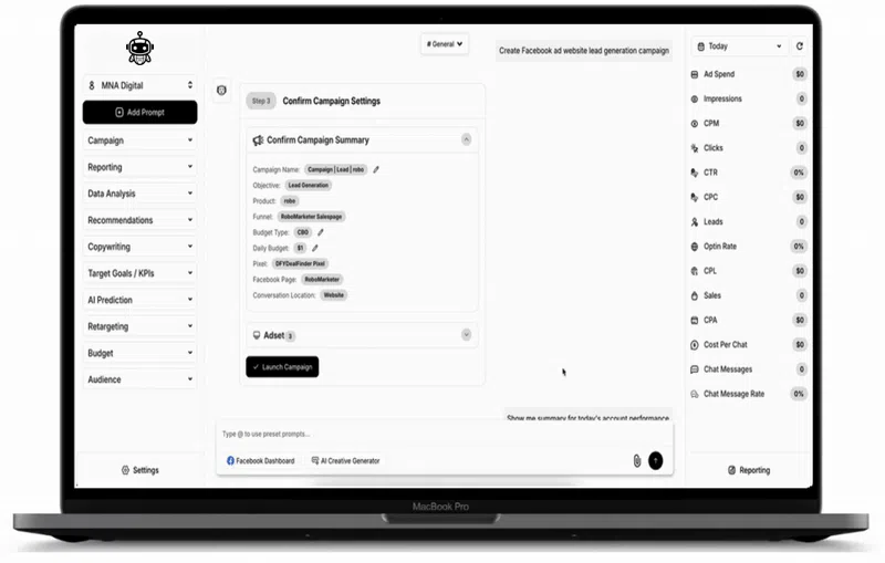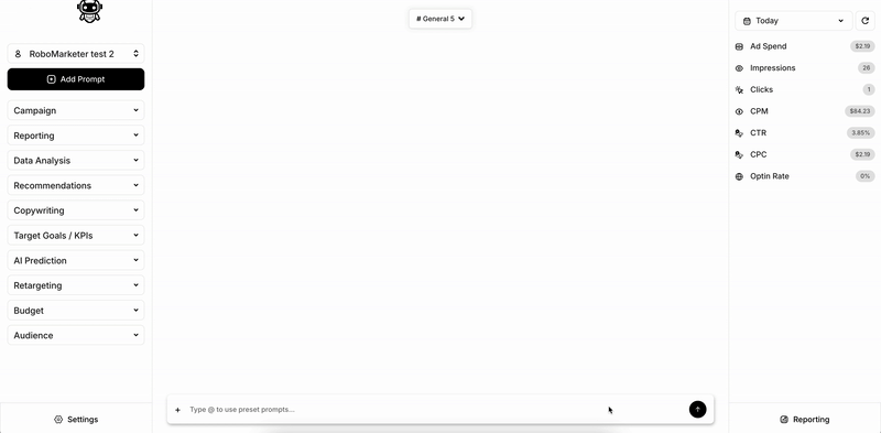 Perform virtually any core marketing workflow inside your ad account with a single chat or click from our 1-click preset prompt library